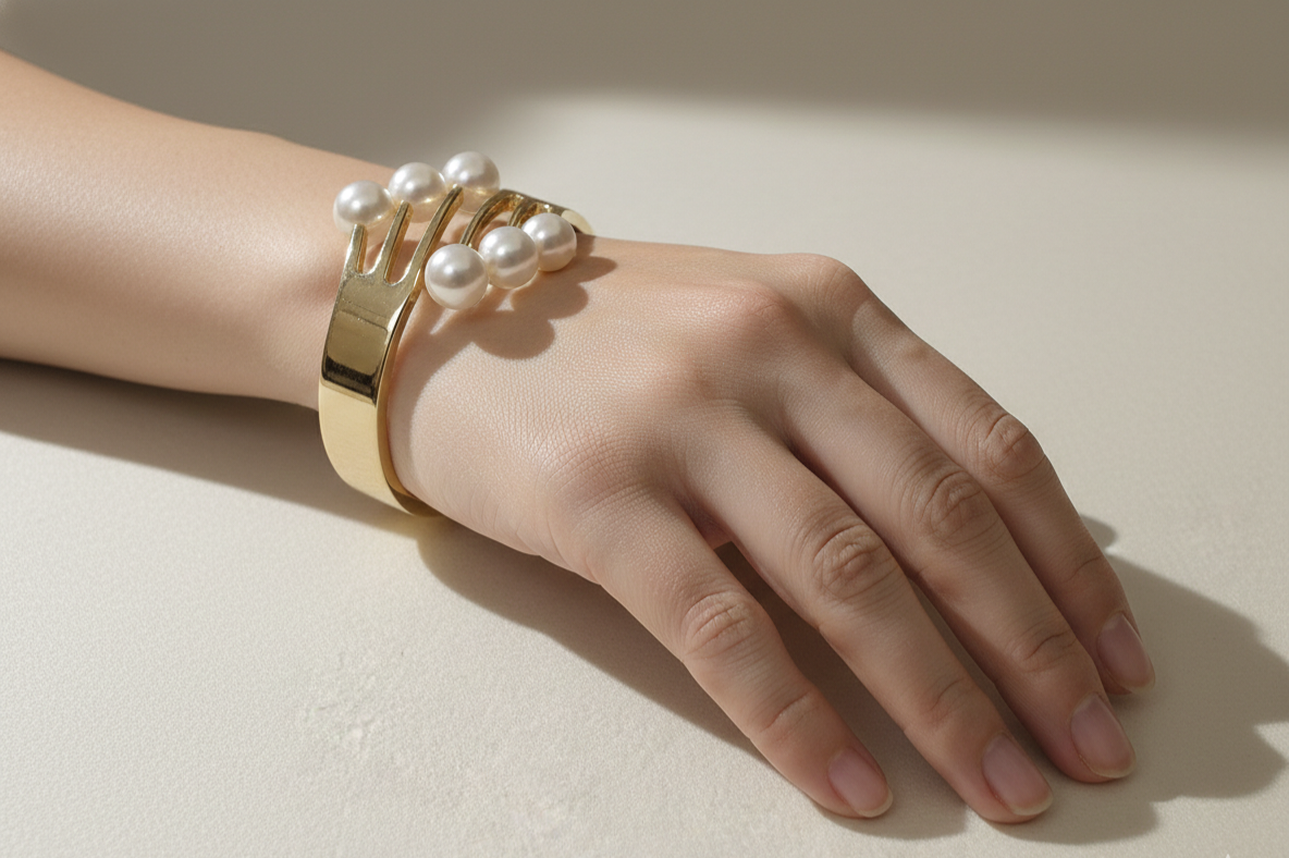 Lustrous pearl-accented cuff in a polished gold-tone finish, featuring a graceful cascading arrangement for instant elegance.